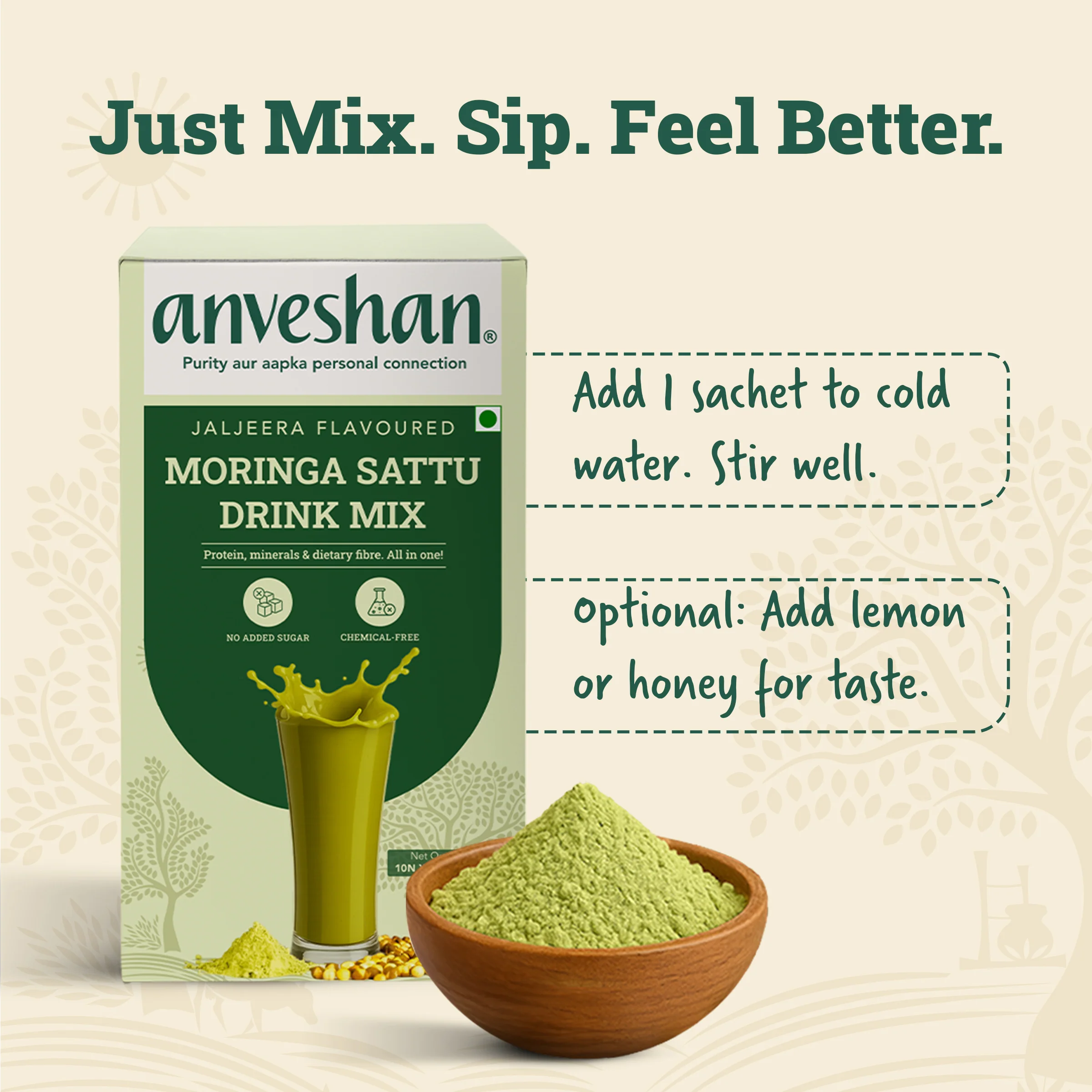 India’s ancient summer drink, crafted for today’s wellness needs. Each sachet blends roasted chana from Bihar with sun-dried moringa and wheatgrass from Hathras. Ground in traditional chakkis and free from sugar or chemicals, it delivers vegan protein, essential minerals, cooling Ayurvedic herbs, and gut-friendly fiber. Whether you’re detoxing, rehydrating, or refueling, it’s your all-in-one, plant-powered drink.